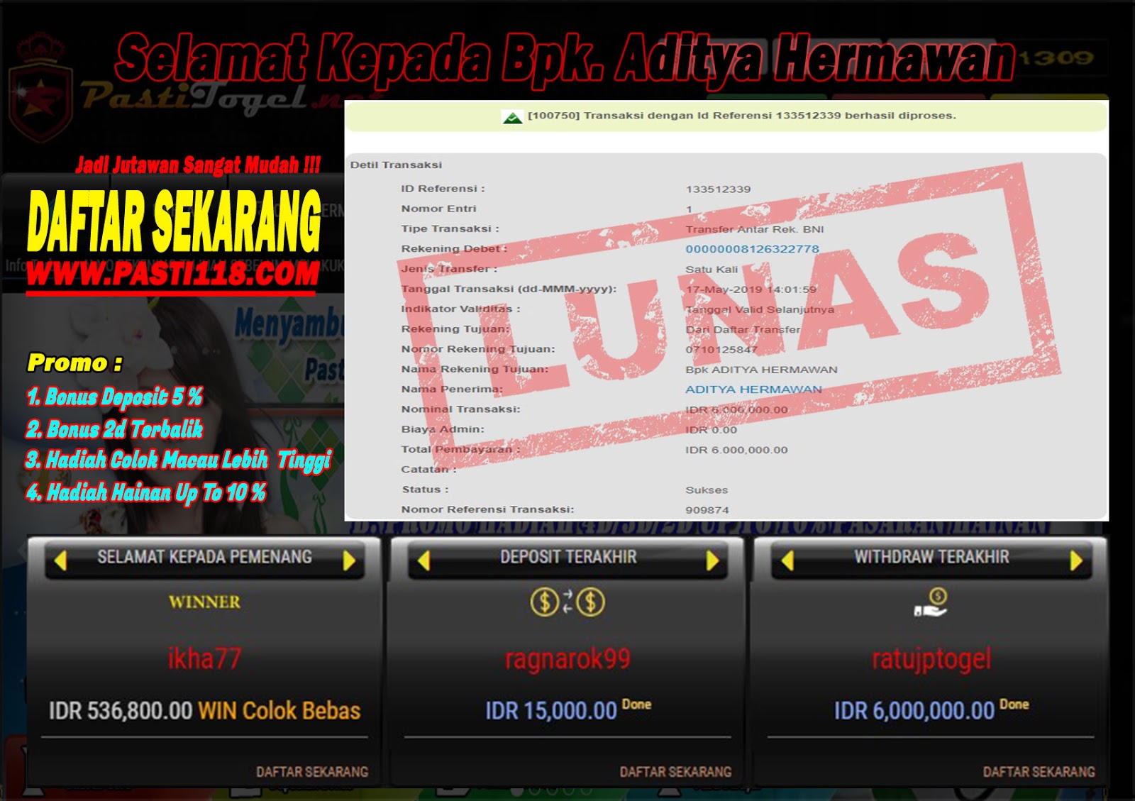 Kemenangan Bermain Togel Online Di Pastijp Pastitogel tanggal 17 mei